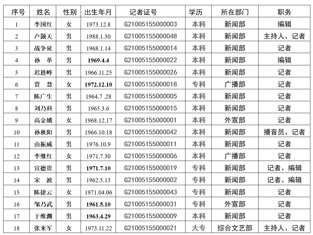 根据新闻出版总署《关于开展新闻记者证核发情况自查工作并重申有关规定的紧急通知》(《2009》299号)、《新闻记者证管理办法》、《关于2009年换发新闻记者证的通知》、《关于期刊申领新闻记者证的有关通知》、《关于广播电影电视新闻单位申领新闻记者证的通知》要求,庄河市广播电视台已对申领记者证人员的资格进行严格审核,现将我单位拟换领新闻记者证人员名单进行公示,公示期2019年12月10日——12月 19 日。举报电话为024-23128457、23128341。
