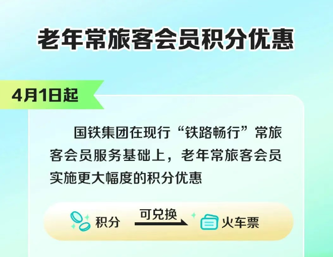 4月1日起,年满60周岁的常旅客会员乘坐旅客列车(暂不含旅游专列、国际列车)时将获得票面金额15倍的积分,相当于普通常旅客会员的3倍。